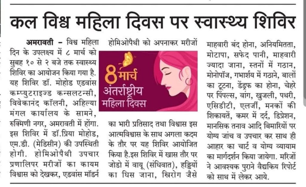 या शिबिरात पाठीच्या तक्रारी, पाळीतील अनियमितता, शरीरावर अतिरिक्त केस येणे, वंध्यत्व, वारंवार गर्भपात, वजन वाढणे-कमी होणे, झोप न लागणे आणि नैराश्य यासारख्या अनेक आरोग्य समस्यांवर सल्ला देण्यात आला. तज्ज्ञ होमिओपॅथी डॉक्टर डाॅ. प्रिया मोहोड (एम.डी.) यांनी महिलांचे मोफत आरोग्य परीक्षण करून आवश्यक मार्गदर्शन केले.